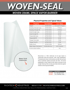 Woven-Seal is a 100% reinforced 14-mil vapor barrier is constructed using only premium, 100% virgin polyethylene. The high density woven reinforcement provides the maximum level of protection against punctures and tears. The woven polyethylene is then coated on both sides to provide not only a bright white top finish, but also give ideal protection against moisture and soil gas permeability.