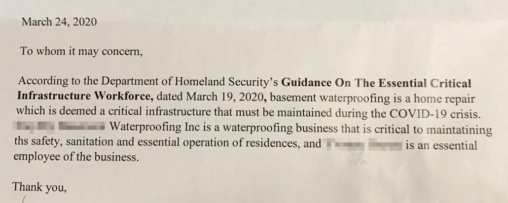 To give employees peace of mind when they’re commuting to and from work, some of our contractors are giving them letters that spell out their necessity to business operations. See below: