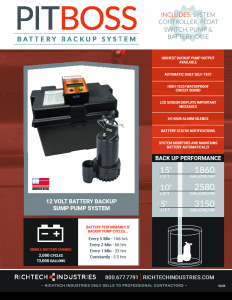 Most powerful 12-volt Battery Backup System pumps 2,580 gallons/hour at a 10′ lift. The PitBoss Battery Backup System features a waterproof circuit board for increased reliability near the sump basin. Warnings and alarms signal the homeowner if there is a problem. Controller automatically tests the backup pump weekly. Includes: built-in charger, float switch, backup pump, and battery case.