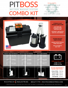 A complete primary and backup sump pump solution. Includes PitBoss 3/4 HP Stainless-Steel Primary Pump, backup pump, system controller, float switches two check valves, “Y” connector and battery case. Also available with a cast-iron primary pump.