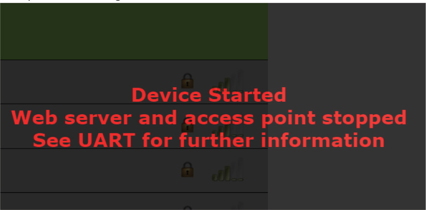 Once you see the message “Device started. Web server and access point stopped. See UART for further information,” Technical Support (1-833-786-7779) can connect the device to your account.